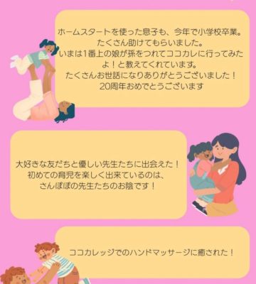 20周年を迎え改めて「あずましい青森の子育てを目指して」の想いを持ち続けて活動して来て、沢山の素晴らしい仲間に出会え、共に「青森で子育てして楽しかった!!青森が好き」と思ってもらえる子育て応援を頑張ってきた幸せな時間を確認出来た時間でした。可愛い人達の笑顔に癒されて~ ママ達とスタッフの元気に支えられた20年間でした。