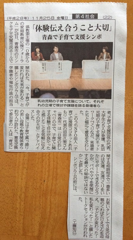 「出番です!地域が育む子ども・家庭支援の力」というテーマで講演して下さった、八戸市出身・横浜市在住の奥山千鶴子さんのお話もとってもよかったし、午後のパネルディスカッションで、八戸・大鰐・十和田で活動しているみなさんのお話も参考になりました。